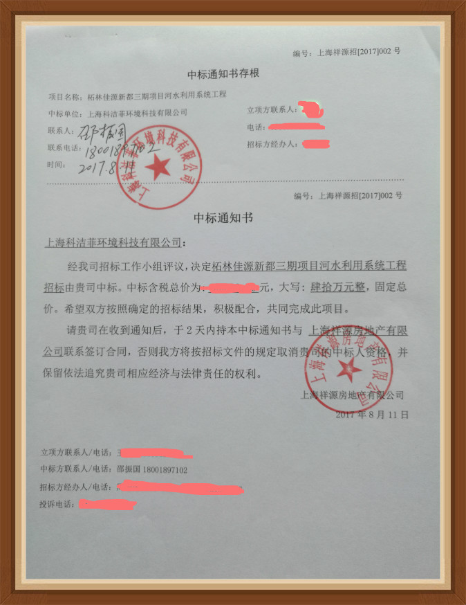 熱烈祝賀上海科潔菲中標佳源地產{柘林佳源夢想廣場海綿城市河水利用項目}
